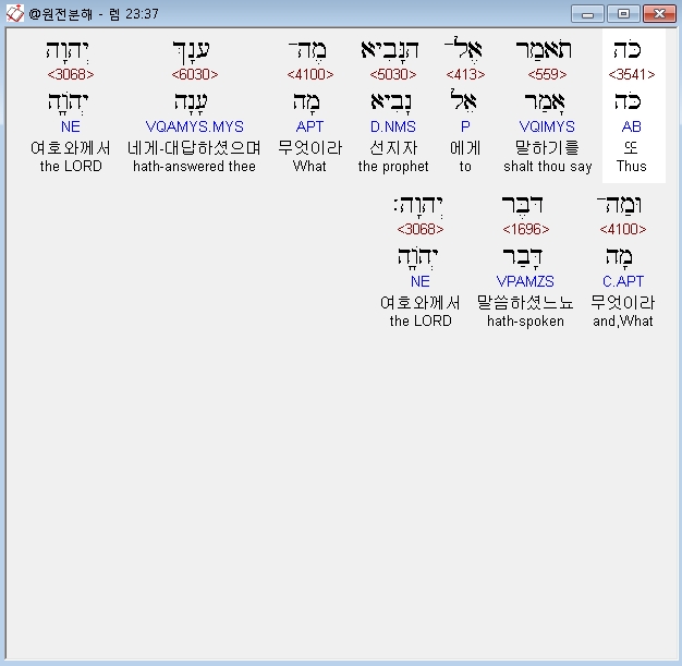 히브리어구약BHS,37 כֹּה תֹאמַר אֶל־הַנָּבִיא מֶה־עָנָךְ יְהוָה וּמַה־דִּבֶּר יְהוָה׃