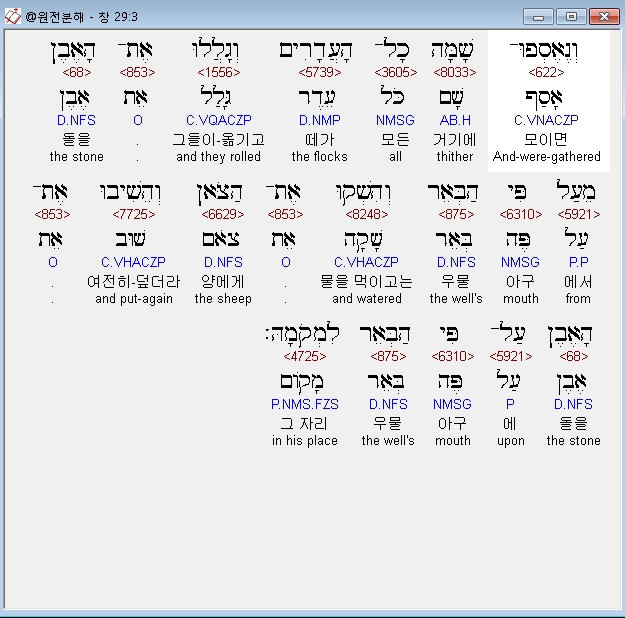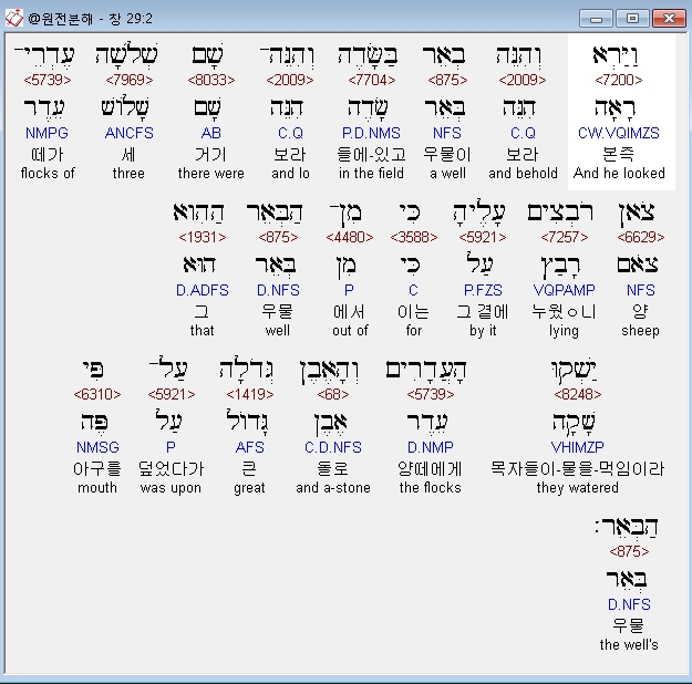 히브리어구약BHS,2 וַיַּרְא וְהִנֵּה בְאֵר בַּשָּׂדֶה וְהִנֵּה־שָׁם שְׁלֹשָׁה עֶדְרֵי־צֹאן רֹבְצִים עָלֶיהָ כִּי מִן־הַבְּאֵר הַהִוא יַשְׁקוּ הָעֲדָרִים וְהָאֶבֶן גְּדֹלָה עַל־פִּי הַבְּאֵר׃