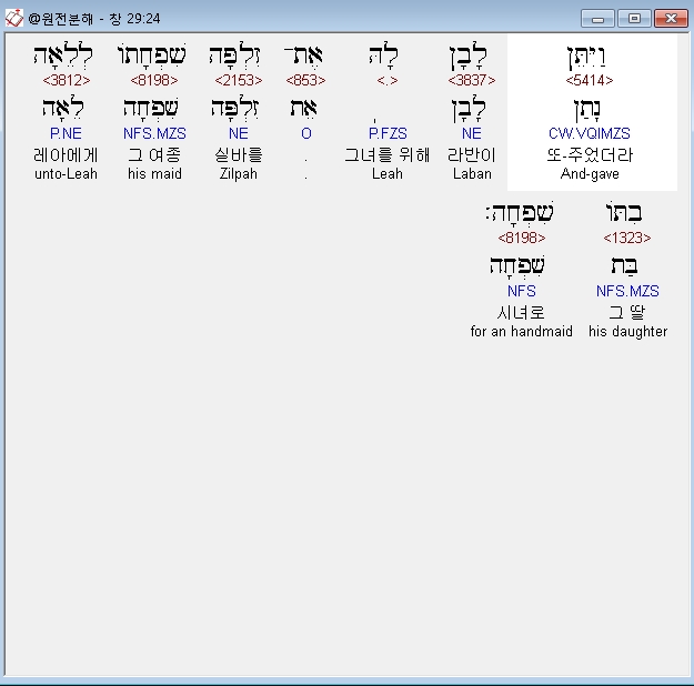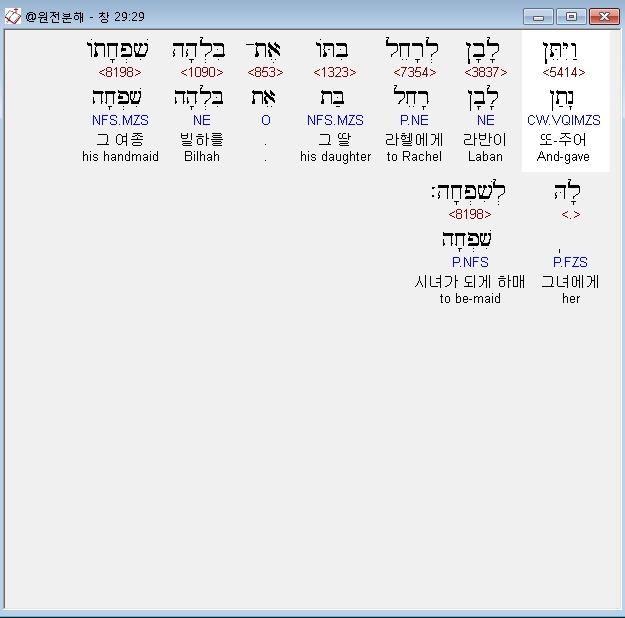 히브리어구약BHS,29 וַיִּתֵּן לָבָן לְרָחֵל בִּתֹּו אֶת־בִּלְהָה שִׁפְחָתֹו לָהּ לְשִׁפְחָה׃