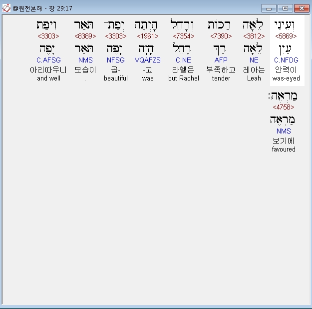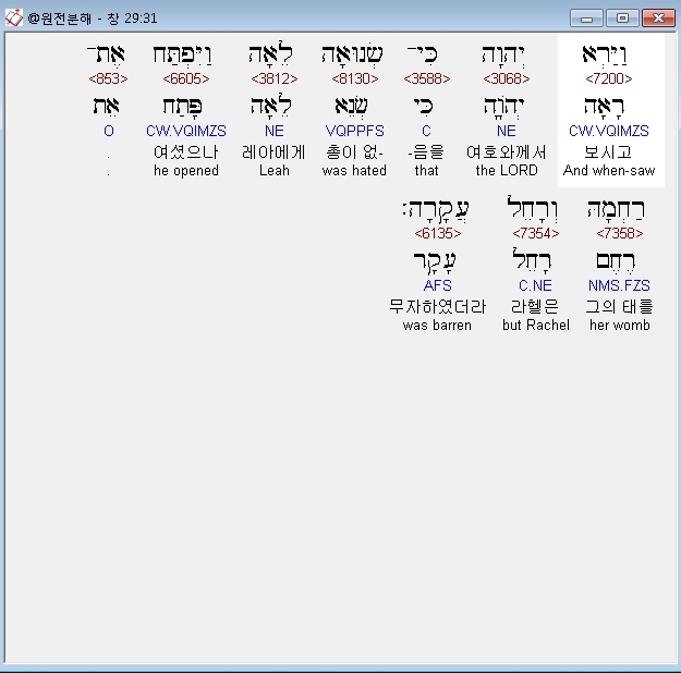 히브리어구약BHS,31 וַיַּרְא יְהוָה כִּי־שְׂנוּאָה לֵאָה וַיִּפְתַּח אֶת־רַחְמָהּ וְרָחֵל עֲקָרָה׃