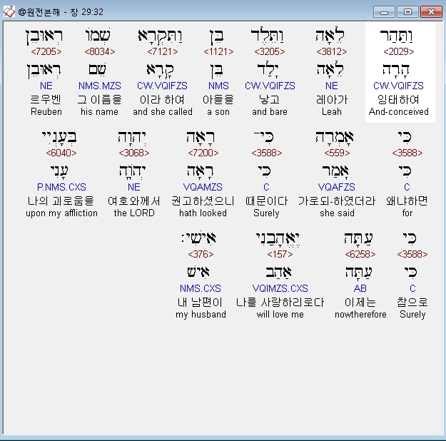 히브리어구약BHS,32 וַתַּהַר לֵאָה וַתֵּלֶד בֵּן וַתִּקְרָא שְׁמֹו רְאוּבֵן כִּי אָמְרָה כִּי־רָאָה יְהוָה בְּעָנְיִי כִּי עַתָּה יֶאֱהָבַנִי אִישִׁי׃