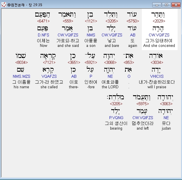 히브리어구약BHS,35 וַתַּהַר עֹוד וַתֵּלֶד בֵּן וַתֹּאמֶר הַפַּעַם אֹודֶה אֶת־יְהוָה עַל־כֵּן קָרְאָה שְׁמֹו יְהוּדָה וַתַּעֲמֹד מִלֶּדֶת׃