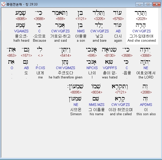 영어NRSV,33 She conceived again and bore a son, and said, "Because the LORD has heard that I am hated, he has given me this son also"; and she named him Simeon.