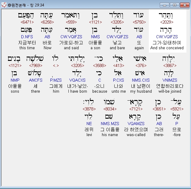 히브리어구약BHS,34 וַתַּהַר עֹוד וַתֵּלֶד בֵּן וַתֹּאמֶר עַתָּה הַפַּעַם יִלָּוֶה אִישִׁי אֵלַי כִּי־יָלַדְתִּי לֹו שְׁלֹשָׁה בָנִים עַל־כֵּן קָרָא־שְׁמֹו לֵוִי׃