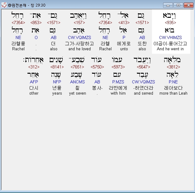 영어NASB,30 So Jacob went in to Rachel also, and indeed he loved Rachel more than Leah, and he served with Laban for another seven years.