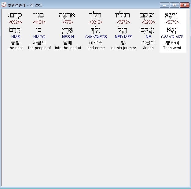발행하여(* - , 이사라글라우) - '들어올리다'란 동사 '나사'(*)의 미래형(의미는 과거)과 '발'을 뜻하는 '레겔'에 3인칭 접미어가 합쳐져 '그의 발을 들어올렸다'란 말이다. 여기서 야곱이 벧엘에서 하나님과 만난 이후 큰 소망과 부푼 꿈으로 새롭게 출발함과 그 발걸음이 가벼워 빠른 속도로 진행했음을 보여 준다.