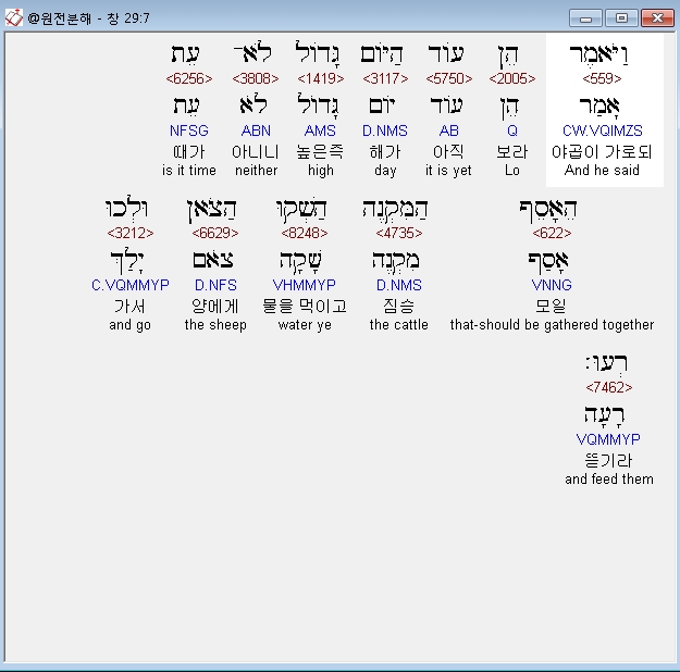 영어NASB,7 And he said, "Behold, it is still high day; it is not time for the livestock to be gathered. Water the sheep, and go, pasture them."