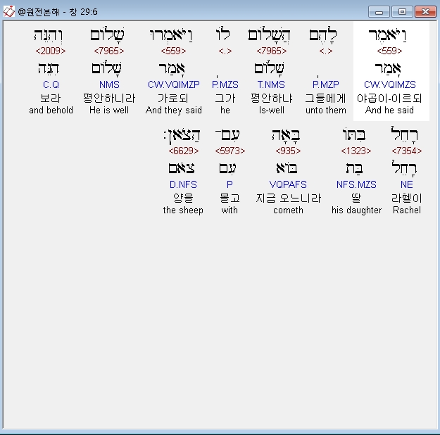 히브리어구약BHS,6 וַיֹּאמֶר לָהֶם הֲשָׁלֹום לֹו וַיֹּאמְרוּ שָׁלֹום וְהִנֵּה רָחֵל בִּתֹּו בָּאָה עִם־הַצֹּאן׃