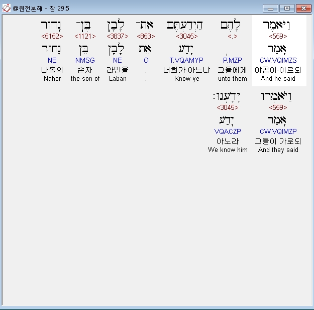 히브리어구약BHS,5 וַיֹּאמֶר לָהֶם הַיְדַעְתֶּם אֶת־לָבָן בֶּן־נָחֹור וַיֹּאמְרוּ יָדָעְנוּ׃
