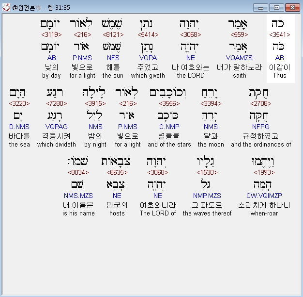 히브리어구약BHS,35 כֹּה אָמַר יְהוָה נֹתֵן שֶׁמֶשׁ לְאֹור יֹוםָם חֻקֹּת יָרֵחַ וְכֹוכָבִים לְאֹור לָיְלָה רֹגַע הַיָּם וַיֶּהֱמוּ גַלָּיו יְהוָה צְבָאֹות שְׁמֹו׃