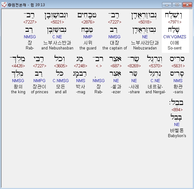 영어NRSV,3 When Jerusalem was taken, all the officials of the king of Babylon came and sat in the middle gate: Nergal-sharezer, Samgar-nebo, Sarsechim the Rab-saris, Nergal-sharezer the Rab-mag, with all the rest of the officials of the king of Babylon.
