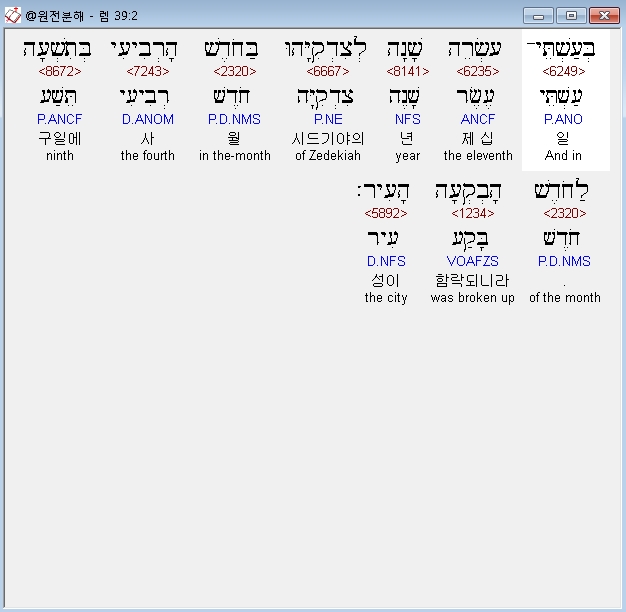 히브리어구약BHS,2 בְּעַשְׁתֵּי־עֶשְׂרֵה שָׁנָה לְצִדְקִיָּהוּ בַּחֹדֶשׁ הָרְבִיעִי בְּתִשְׁעָה לַחֹדֶשׁ הָבְקְעָה הָעִיר׃