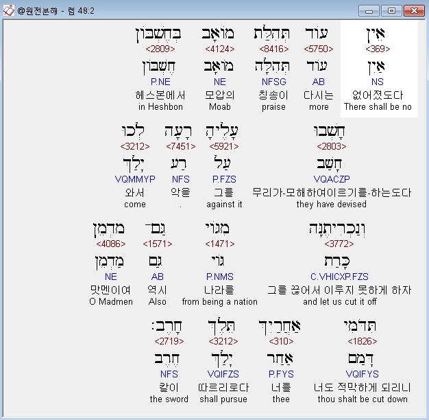 히브리어구약BHS,2 אֵין עֹוד תְּהִלַּת מֹואָב בְּחֶשְׁבֹּון חָשְׁבוּ עָלֶיהָ רָעָה לְכוּ וְנַכְרִיתֶנָּה מִגֹּוי גַּם־מַדְמֵן תִּדֹּמִּי אַחֲרַיִךְ תֵּלֶךְ חָרֶב׃