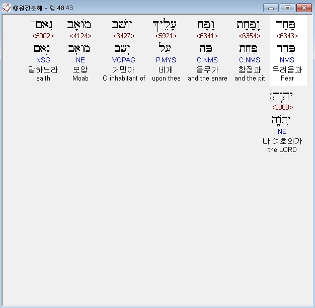 히브리어구약BHS,43 פַּחַד וָפַחַת וָפָח עָלֶיךָ יֹושֵׁב מֹואָב נְאֻם־יְהוָה׃