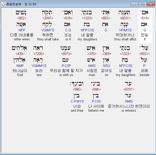 히브리어구약BHS,50 אִם־תְּעַנֶּה אֶת־בְּנֹתַי וְאִם־תִּקַּח נָשִׁים עַל־בְּנֹתַי אֵין אִישׁ עִמָּנוּ רְאֵה אֱלֹהִים עֵד בֵּינִי וּבֵינֶךָ׃