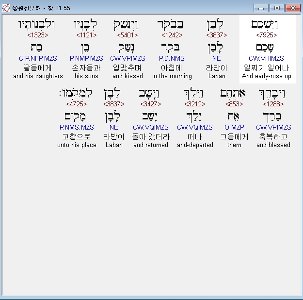 히브리어구약BHS,55 וַיַּשְׁכֵּם לָבָן בַּבֹּקֶר וַיְנַשֵּׁק לְבָנָיו וְלִבְנֹותָיו וַיְבָרֶךְ אֶתְהֶם וַיֵּלֶךְ וַיָּשָׁב לָבָן לִמְקֹמֹו׃