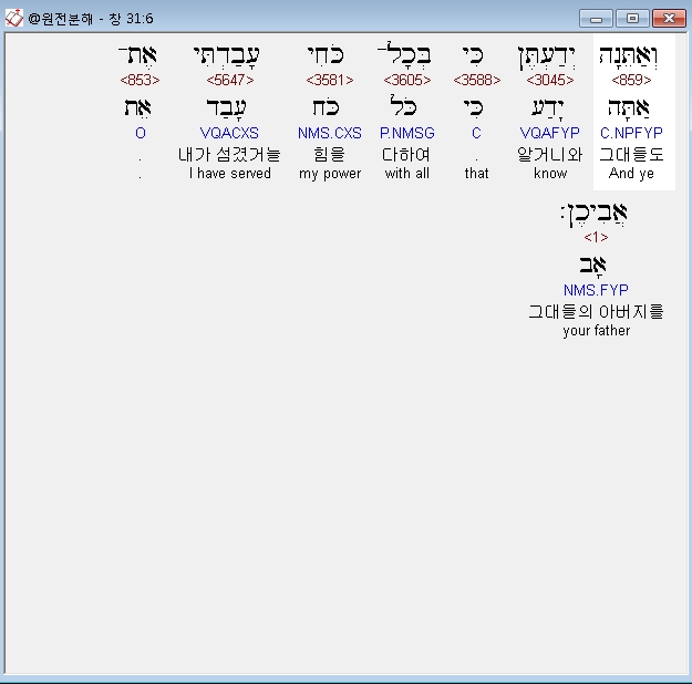 히브리어구약BHS,6 וְאַתֵּנָה יְדַעְתֶּן כִּי בְּכָל־כֹּחִי עָבַדְתִּי אֶת־אֲבִיכֶן׃