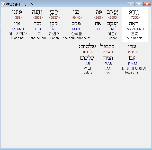 히브리어구약BHS,2 וַיַּרְא יַעֲקֹב אֶת־פְּנֵי לָבָן וְהִנֵּה אֵינֶנּוּ עִמֹּו כִּתְמֹול שִׁלְשֹׁום׃