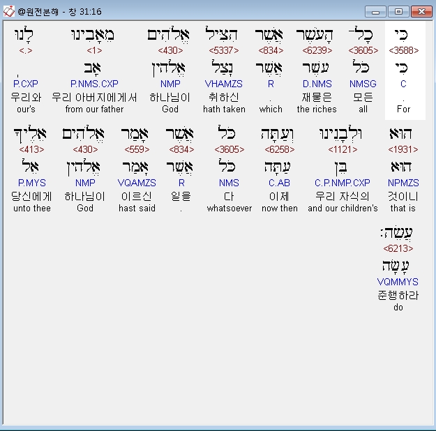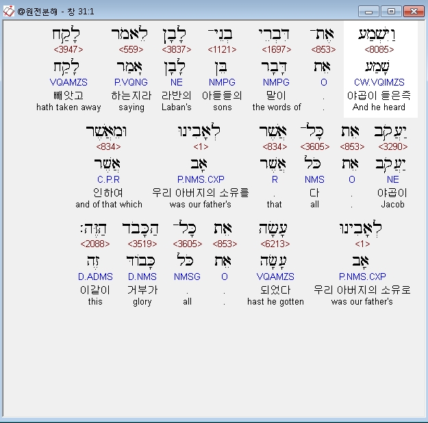 히브리어구약BHS,1 וַיִּשְׁמַע אֶת־דִּבְרֵי בְנֵי־לָבָן לֵאמֹר לָקַח יַעֲקֹב אֵת כָּל־אֲשֶׁר לְאָבִינוּ וּמֵאֲשֶׁר לְאָבִינוּ עָשָׂה אֵת כָּל־הַכָּבֹד הַזֶּה׃