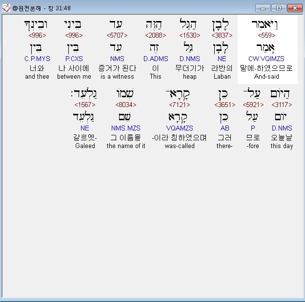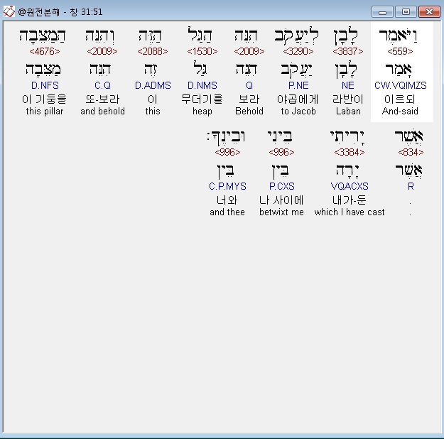 히브리어구약BHS,51 וַיֹּאמֶר לָבָן לְיַעֲקֹב הִנֵּה הַגַּל הַזֶּה וְהִנֵּה הַמַצֵּבָה אֲשֶׁר יָרִיתִי בֵּינִי וּבֵינֶךָ׃