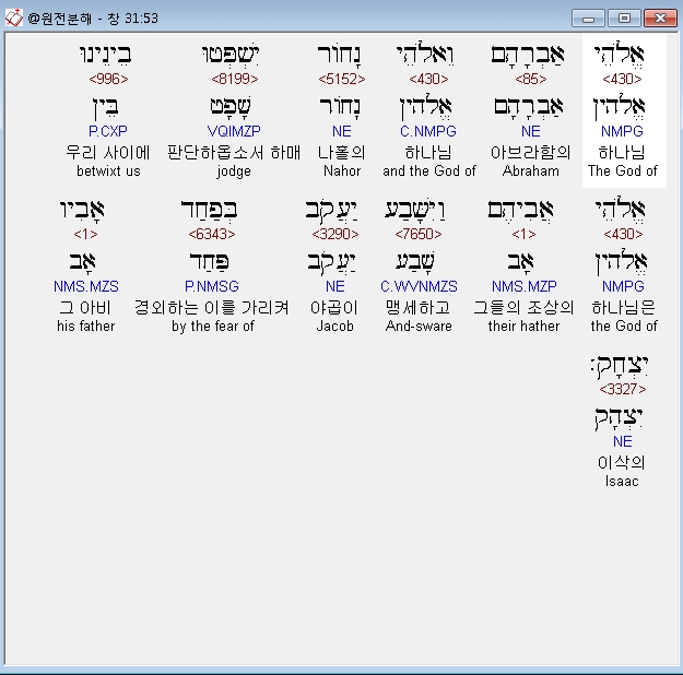 히브리어구약BHS,53 אֱלֹהֵי אַבְרָהָם וֵאלֹהֵי נָחֹור יִשְׁפְּטוּ בֵינֵינוּ אֱלֹהֵי אֲבִיהֶם וַיִּשָּׁבַע יַעֲקֹב בְּפַחַד אָבִיו יִצְחָק׃