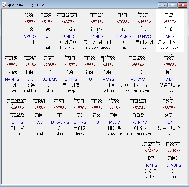 히브리어구약BHS,52 עֵד הַגַּל הַזֶּה וְעֵדָה הַמַּצֵּבָה אִם־אָנִי לֹא־אֶעֱבֹר אֵלֶיךָ אֶת־הַגַּל הַזֶּה וְאִם־אַתָּה לֹא־תַעֲבֹר אֵלַי אֶת־הַגַּל הַזֶּה וְאֶת־הַמַּצֵּבָה הַזֹּאת לְרָעָה׃
