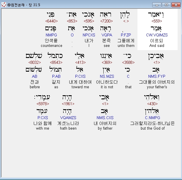 히브리어구약BHS,5 וַיֹּאמֶר לָהֶן רֹאֶה אָנֹכִי אֶת־פְּנֵי אֲבִיכֶן כִּי־אֵינֶנּוּ אֵלַי כִּתְמֹל שִׁלְשֹׁם וֵאלֹהֵי אָבִי הָיָה עִמָּדִי׃