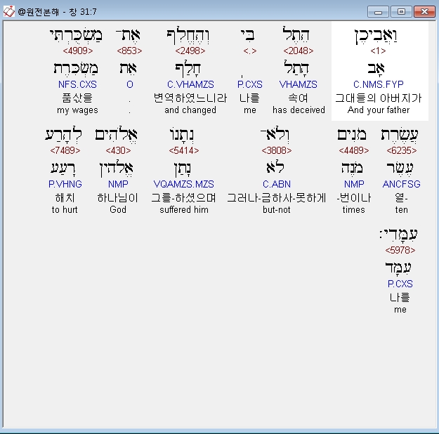 영어NRSV,7 yet your father has cheated me and changed my wages ten times, but God did not permit him to harm me.