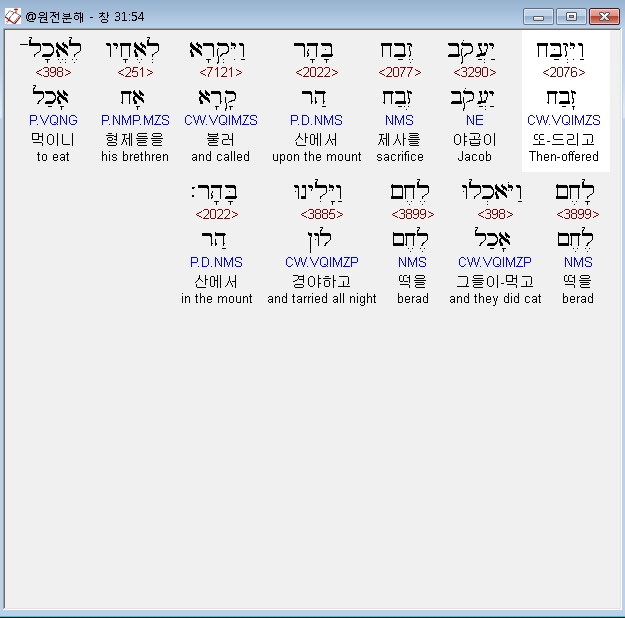 영어NASB,54 Then Jacob offered a sacrifice on the mountain, and called his kinsmen to the meal; and they ate the meal and spent the night on the mountain.
