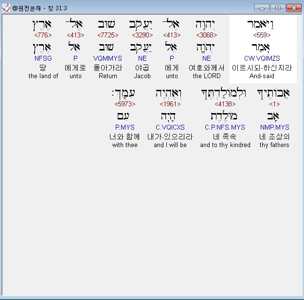 히브리어구약BHS,3 וַיֹּאמֶר יְהוָה אֶל־יַעֲקֹב שׁוּב אֶל־אֶרֶץ אֲבֹותֶיךָ וּלְמֹולַדְתֶּךָ וְאֶהְיֶה עִמָּךְ׃