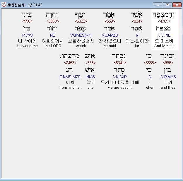 히브리어구약BHS,49 וְהַמִּצְפָּה אֲשֶׁר אָמַר יִצֶף יְהוָה בֵּינִי וּבֵינֶךָ כִּי נִסָּתֵר אִישׁ מֵרֵעֵהוּ׃