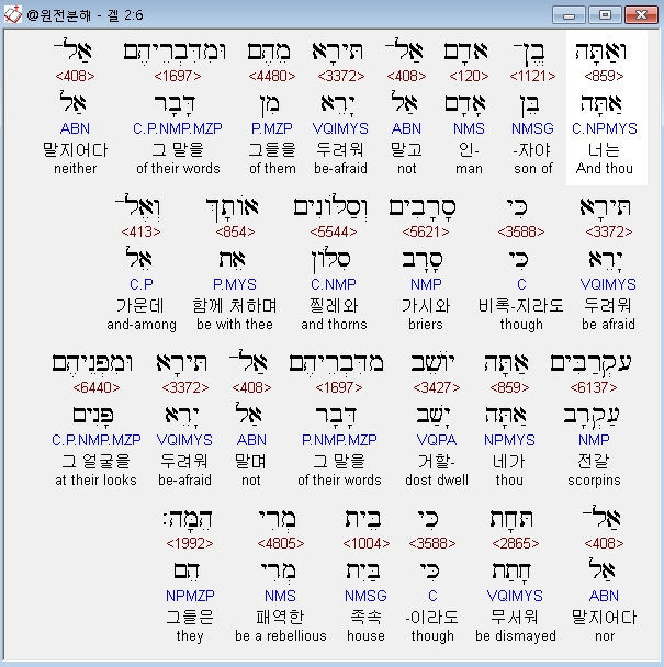 히브리어구약BHS,6 וְאַתָּה בֶן־אָדָם אַל־תִּירָא מֵהֶם וּמִדִּבְרֵיהֶם אַל־תִּירָא כִּי סָרָבִים וְסַלֹּונִים אֹותָךְ וְאֶל־עַקְרַבִּים אַתָּה יֹושֵׁב מִדִּבְרֵיהֶם אַל־תִּירָא וּמִפְּנֵיהֶם אַל־תֵּחָת כִּי בֵּית מְרִי הֵמָּה׃