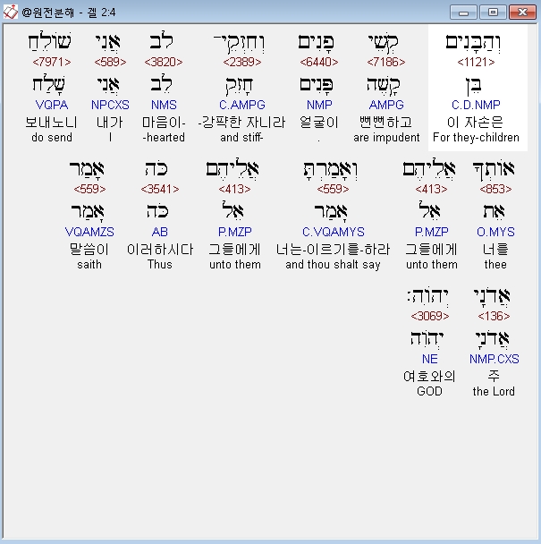히브리어구약BHS,4 וְהַבָּנִים קְשֵׁי פָנִים וְחִזְקֵי־לֵב אֲנִי שֹׁולֵחַ אֹותְךָ אֲלֵיהֶם וְאָמַרְתָּ אֲלֵיהֶם כֹּה אָמַר אֲדֹנָי יְהֹוִה׃