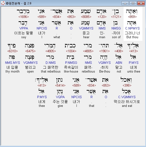 히브리어구약BHS,8 וְאַתָּה בֶן־אָדָם שְׁמַע אֵת אֲשֶׁר־אֲנִי מְדַבֵּר אֵלֶיךָ אַל־תְּהִי־מֶרִי כְּבֵית הַמֶּרִי פְּצֵה פִיךָ וֶאֱכֹל אֵת אֲשֶׁר־אֲנִי נֹתֵן אֵלֶיךָ׃
