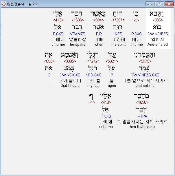 히브리어구약BHS,2 וַתָּבֹא בִי רוּחַ כַּאֲשֶׁר דִּבֶּר אֵלַי וַתַּעֲמִדֵנִי עַל־רַגְלָי וָאֶשְׁמַע אֵת מִדַּבֵּר אֵלָי׃ ף
