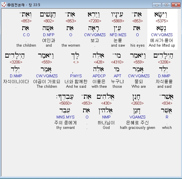 히브리어구약BHS,5 וַיִּשָּׂא אֶת־עֵינָיו וַיַּרְא אֶת־הַנָּשִׁים וְאֶת־הַיְלָדִים וַיֹּאמֶר מִי־אֵלֶּה לָּךְ וַיֹּאמַר הַיְלָדִים אֲשֶׁר־חָןַן אֱלֹהִים אֶת־עַבְדֶּךָ׃