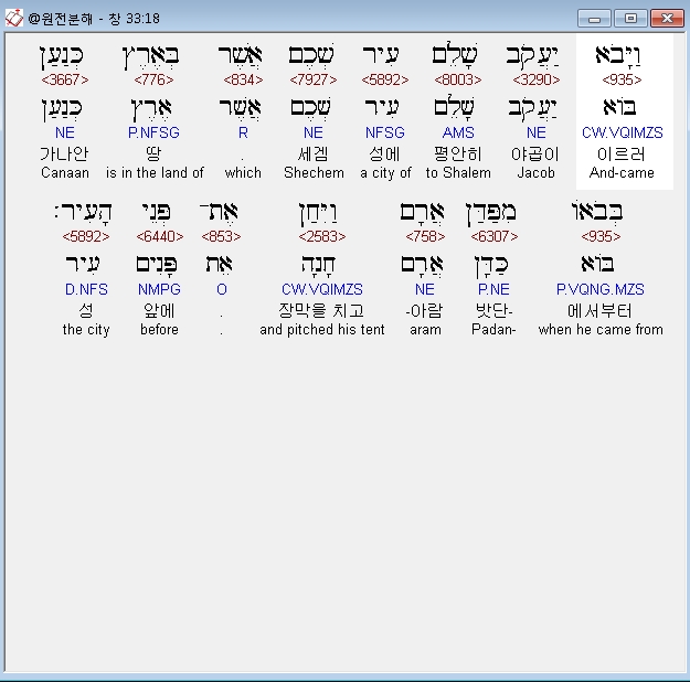 히브리어구약BHS,18 וַיָּבֹא יַעֲקֹב שָׁלֵם עִיר שְׁכֶם אֲשֶׁר בְּאֶרֶץ כְּנַעַן בְּבֹאֹו מִפַּדַּן אֲרָם וַיִּחַן אֶת־פְּנֵי הָעִיר׃