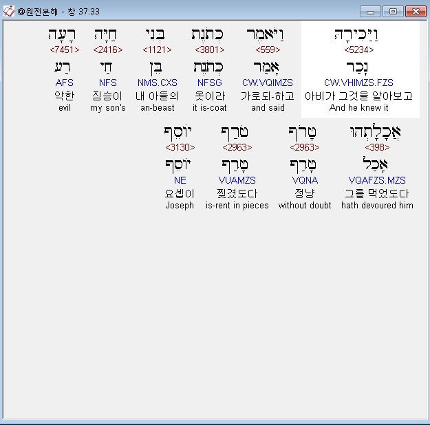 히브리어구약BHS,33 וַיַּכִּירָהּ וַיֹּאמֶר כְּתֹנֶת בְּנִי חַיָּה רָעָה אֲכָלָתְהוּ טָרֹף טֹרַף יֹוסֵף׃