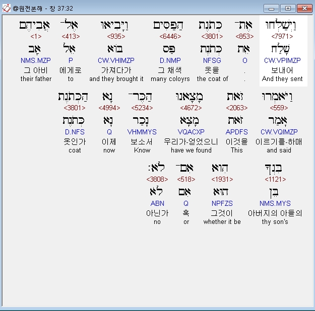 히브리어구약BHS,32 וַיְשַׁלְּחוּ אֶת־כְּתֹנֶת הַפַּסִּים וַיָּבִיאוּ אֶל־אֲבִיהֶם וַיֹּאמְרוּ זֹאת מָצָאנוּ הַכֶּר־נָא הַכְּתֹנֶת בִּנְךָ הִוא אִם־לֹא׃