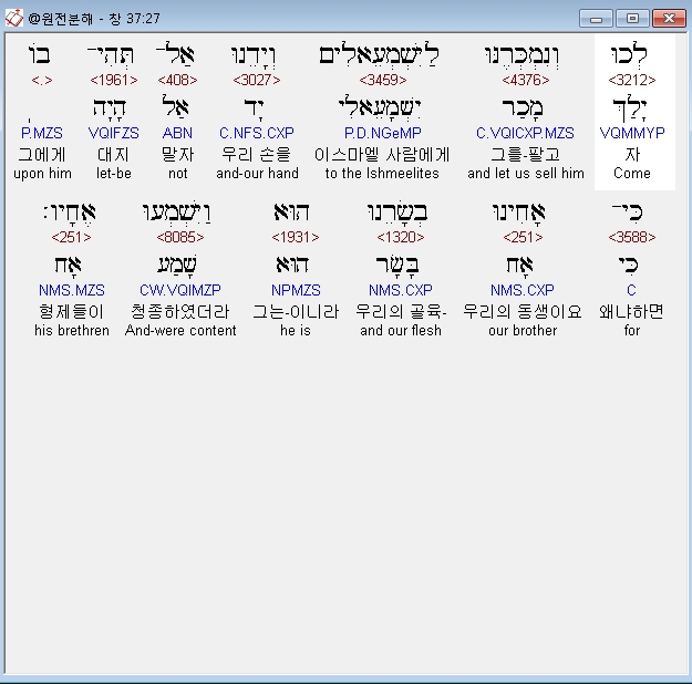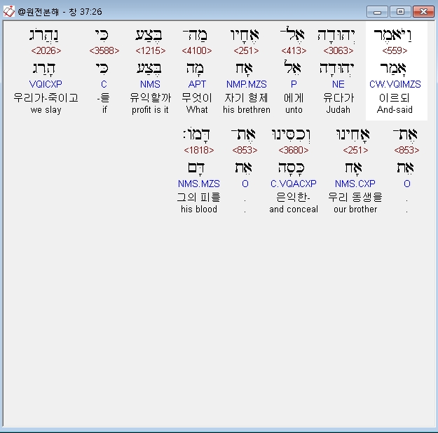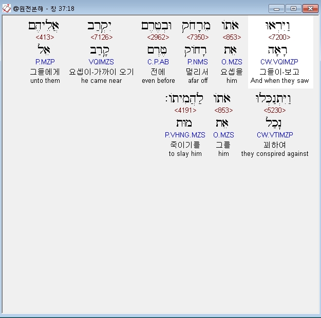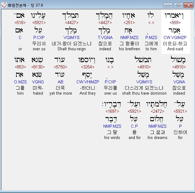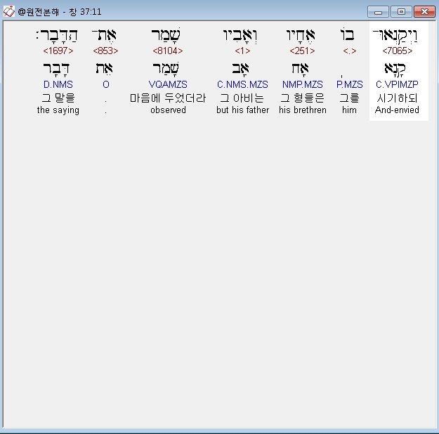 더욱 미워하였더라(*, 요시푸 오드 세노) - '더하다', '증가하다'란 뜻을 가진 동사 '야사프'에 2인칭 접미어가 붙고 '미워하다'란 동사 '사네'의 부정사와 '대우'를 뜻하는 부사 '오드'가 합쳐져 '(그를) 더욱 미워하는 것이 증거되었다'란 말이다.