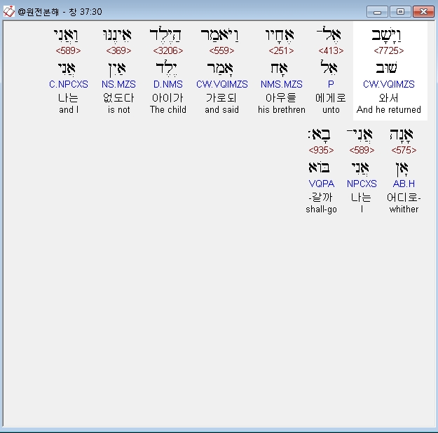 히브리어구약BHS,30 וַיָּשָׁב אֶל־אֶחָיו וַיֹּאמַר הַיֶּלֶד אֵינֶנּוּ וַאֲנִי אָנָה אֲנִי־בָא׃