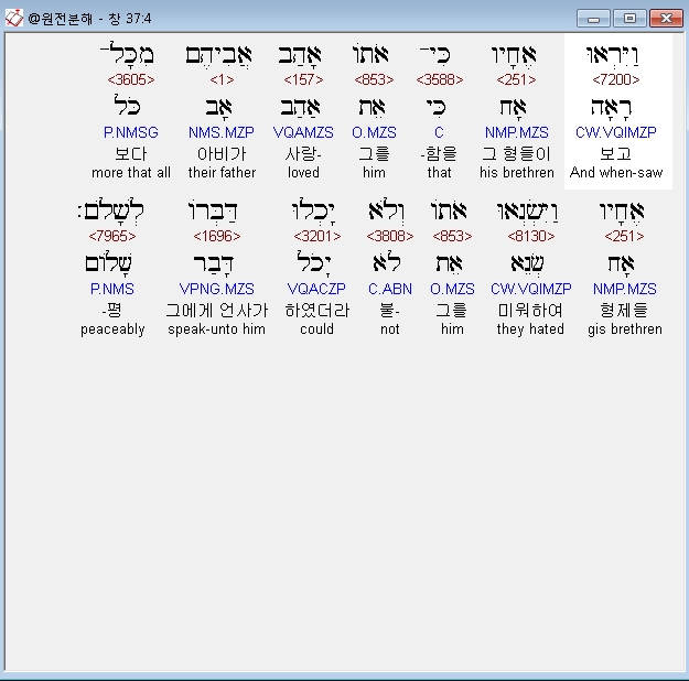 히브리어구약BHS,4 וַיִּרְאוּ אֶחָיו כִּי־אֹתֹו אָהַב אֲבִיהֶם מִכָּל־אֶחָיו וַיִּשְׂנְאוּ אֹתֹו וְלֹא יָכְלוּ דַּבְּרֹו לְשָׁלֹם׃