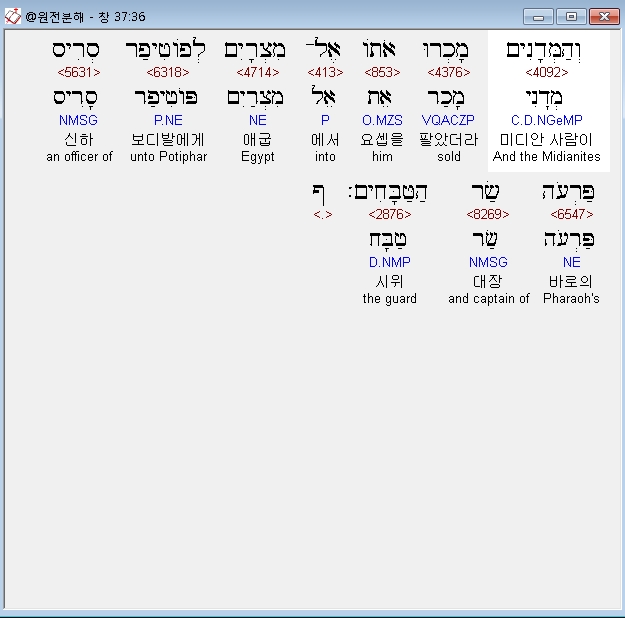 히브리어구약BHS,36 וְהַמְּדָנִים מָכְרוּ אֹתֹו אֶל־מִצְרָיִם לְפֹוטִיפַר סְרִיס פַּרְעֹה שַׂר הַטַּבָּחִים׃ ף