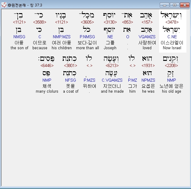 히브리어구약BHS,3 וְיִשְׂרָאֵל אָהַב אֶת־יֹוסֵף מִכָּל־בָּנָיו כִּי־בֶן־זְקֻנִים הוּא לֹו וְעָשָׂה לֹו כְּתֹנֶת פַּסִּים׃