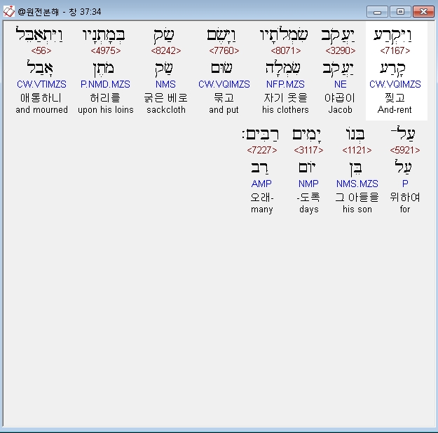 히브리어구약BHS,34 וַיִּקְרַע יַעֲקֹב שִׂמְלֹתָיו וַיָּשֶׂם שַׂק בְּמָתְנָיו וַיִּתְאַבֵּל עַל־בְּנֹו יָמִים רַבִּים׃