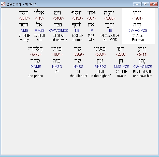 히브리어구약BHS,21 וַיְהִי יְהוָה אֶת־יֹוסֵף וַיֵּט אֵלָיו חָסֶד וַיִּתֵּן חִנֹּו בְּעֵינֵי שַׂר בֵּית־הַסֹּהַר׃