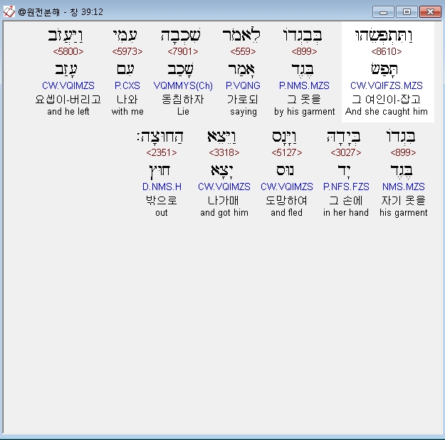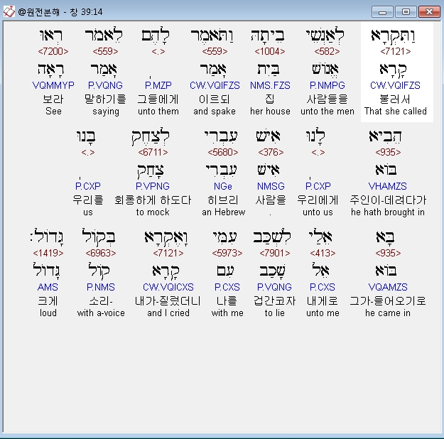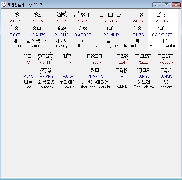 헬라어구약Septuagint,17 και ελαλησεν αυτω κατα τα ρηματα ταυτα λεγουσα εισηλθεν προς με ο παις ο εβραιος ον εισηγαγες προς ημας εμπαιξαι μοι και ειπεν μοι κοιμηθησομαι μετα σου