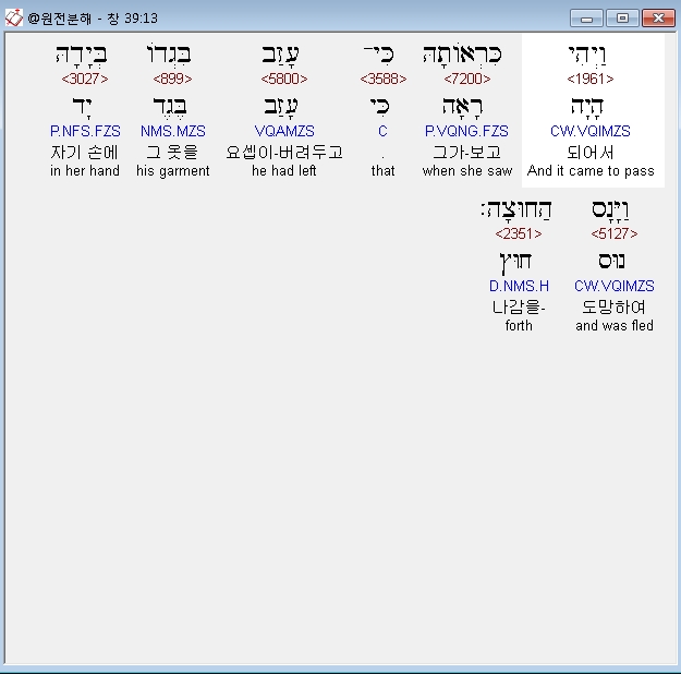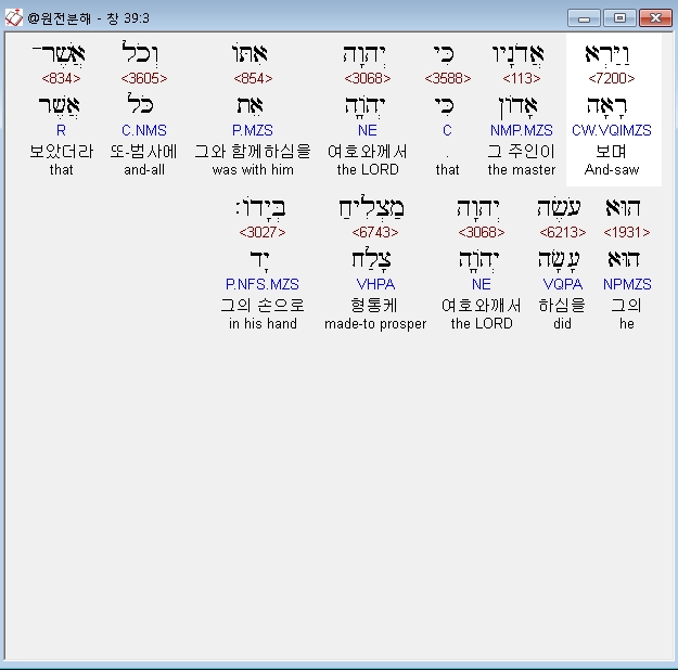 히브리어구약BHS,3 וַיַּרְא אֲדֹנָיו כִּי יְהוָה אִתֹּו וְכֹל אֲשֶׁר־הוּא עֹשֶׂה יְהוָה מַצְלִיחַ בְּיָדֹו׃