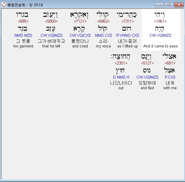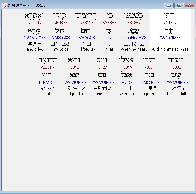 히브리어구약BHS,18 וַיְהִי כַּהֲרִימִי קֹולִי וָאֶקְרָא וַיַּעֲזֹב בִּגְדֹו אֶצְלִי וַיָּנָס הַחוּצָה׃