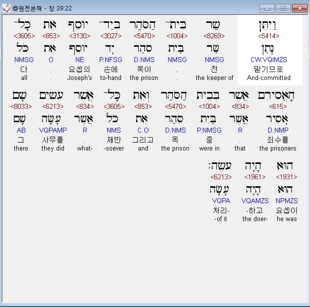 히브리어구약BHS,22 וַיִּתֵּן שַׂר בֵּית־הַסֹּהַר בְּיַד־יֹוסֵף אֵת כָּל־הָאֲסִירִם אֲשֶׁר בְּבֵית הַסֹּהַר וְאֵת כָּל־אֲשֶׁר עֹשִׂים שָׁם הוּא הָיָה עֹשֶׂה׃